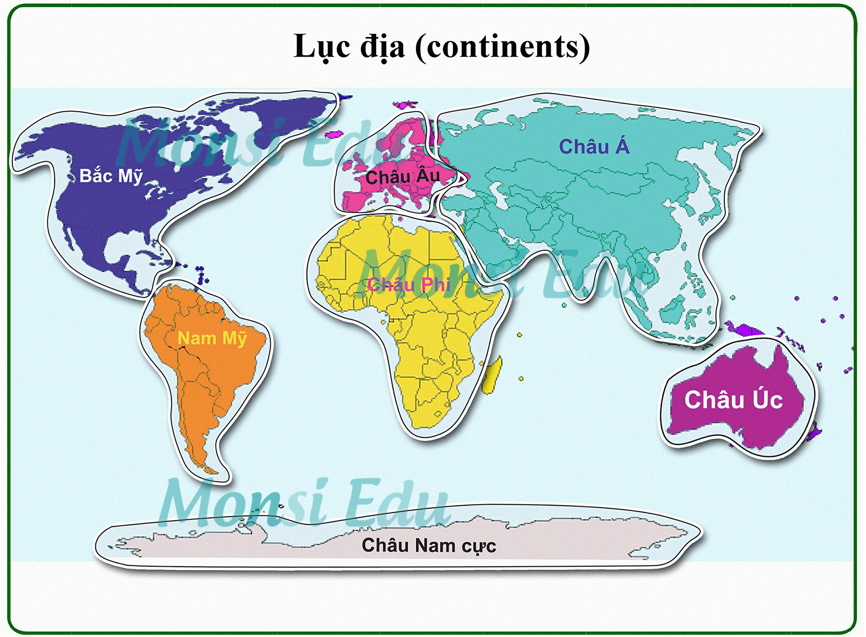 • Các lục địa trên trái đất: Châu Mỹ, Châu Phi, Châu Á, …