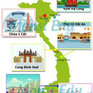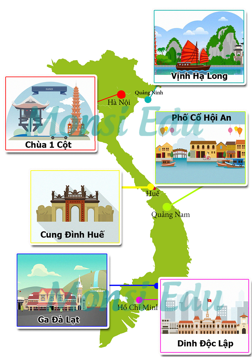 • Các địa danh ở Việt Nam: Chùa 1 Cột ở Hà Nội, Đảo Phú Quốc,…
