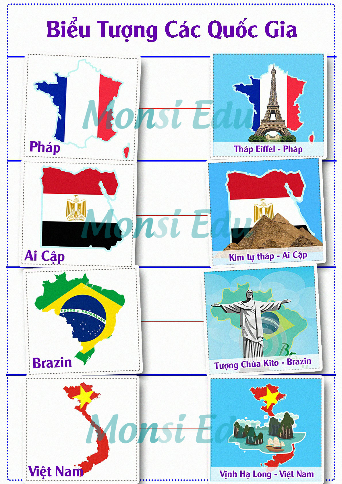 • Biểu tượng đặc trưng quốc gia: Tháp Eiffle của Pháp, Vịnh Hạ Long của Việt Nam, …